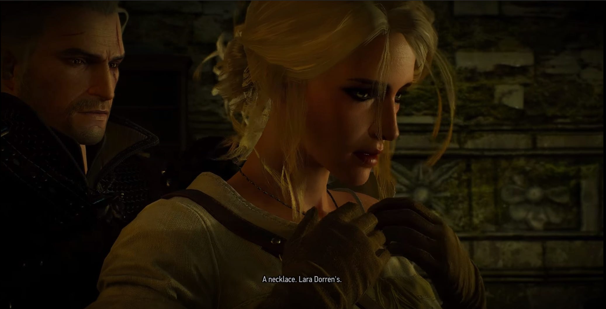 The second decision demonstrates the forcing of roles onto others, a common act many fathers do. During the second decision, when Geralt, Yennefer (a possible love interest), and Ciri sneak into Avallac'h’s hideout and learn the truth about him, Ciri becomes visibly frustrated. At this point Geralt can tell her to calm down or let her express her feelings, if the player chooses the former once again Geralt dismisses his daughter’s feelings. Even worse the player is treated to a shot where Geralt puts a necklace on Ciri, a necklace which represents the role of the chosen one, a role which Ciri does not wish to play. In putting on the necklace for her, Geralt is forcing this role upon her, like how many fathers may force a role onto their own children.