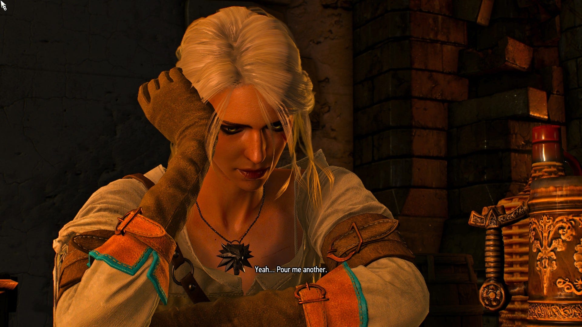 The ending of the game is determined by 5 crucial decisions, Geralt (in turn the player) has to make. The three decisions I found the most striking looking at the game in retrospect were, A) the decision at Kaer Morhen when Ciri get frustrated at being the chosen one, B) the decision at Avallac'h’s (Ciri’s friend) hideout after Ciri finds out he was using her, and C) the decision before meeting the Lodge. In the first case, if Geralt tells Ciri to ‘just relax’ (a thing many boys and girls are told to do by adults) in response to Ciri’s request for advice and dismisses Ciri’s feelings, the player is then treated to a scene where the two are drinking together. In this scene Ciri is clearly still frustrated at the situation and indifferently as Geralt to ‘pour her another’. The drinking within this sense also mirrors the Blood Barons drinking.